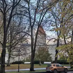 The moment we reached the observation deck, the rain miraculously stopped, and sunlight broke through! Looking down at the thousand-year-old Tamlin Old Town, the pointed spires, red rooftops, and golden trees appeared like a flowing golden painting 🌟