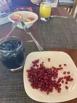 🍽️ Food: Have an iced coffee ☕️ or iced Coke for breakfast, or even a glass of champagne 🥂 Cheers! Breakfast drinks are all free 🆓 You can also play with pomegranates, and there is a wide variety of fruits. You can choose fruits and have the chef cut them for you.