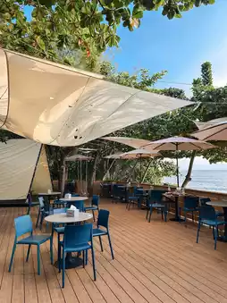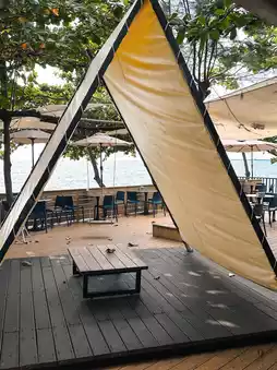 This seaside cafe in Fangshan feels like a small forest. Simple wood tones blend with the lush greenery of the trees. Outdoor seating overlooks the endless ocean. Enjoying a meal while listening to the crashing waves is such a relaxing experience.