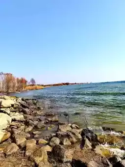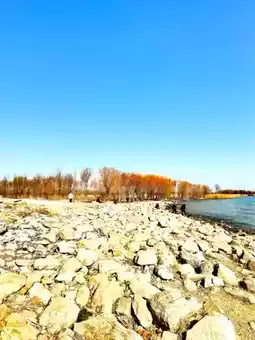 The sky was blue and the lake was clear. The rocks on the shore were jagged, and the shoreline was winding.