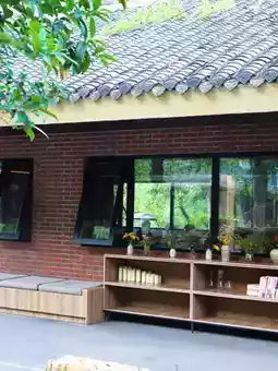 🏡 The lodge is a renovated 1960s "Daoban" (road maintenance workers' quarters) in the Qinling Mountains, featuring red brick walls, gray-tiled roofs, old metasequoia trees, and weathered wooden doors full of history.