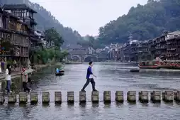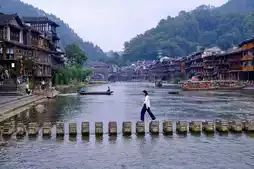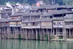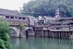 The distant mountains, stilted buildings, Tuojiang River, and nearby boats and guesthouses