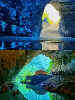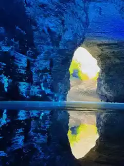Touch the icy underground river water and observe stalactite reflections.