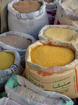 Next, a row of spices and grains. Large canvas bags filled with wheat, barley, and couscous, the aroma of turmeric, cinnamon, and paprika wafted through the freshly baked morning bread, making this small alley even warmer than it appeared.