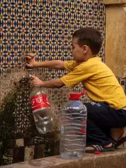 In another alleyway, we saw a boy filling plastic bottles with water from a mosaic-tiled tap. Ancient Arabic fonts still appear around these fountains, a testament to the Medina's continued reliance on infrastructure inherited from centuries ago.
