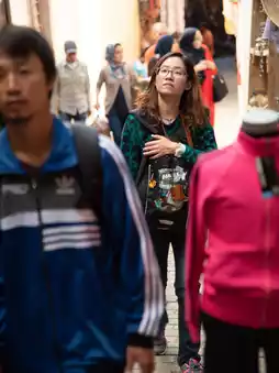 Sunlight filtered through the wooden roofs and old structures supporting the walls of the alleys, and people passed by. Some were tourists looking down at the brightly colored goods, others were locals walking along, knowing their way around. The cries of leather bags, shoes, and carpets echoed through the air.