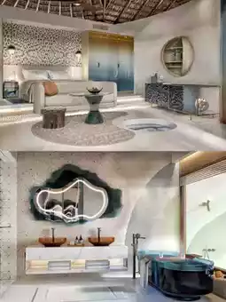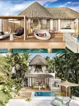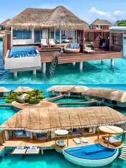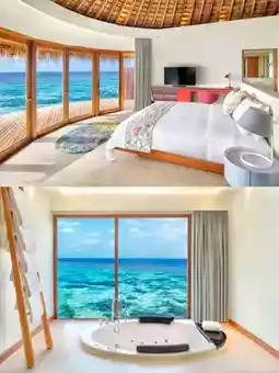 There are 77 villas on the island. All water villas are equipped with private swimming pools, glass floors, and some rooms also have net beds. Although the place is not large, there are 4 restaurants and 2 bars, so there is no need to worry about food and beverage. You can relax at AWAY Spa, which offers massage menus, herbal and facial treatments.