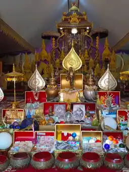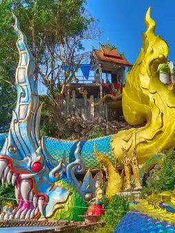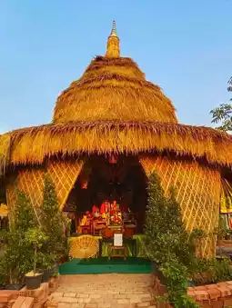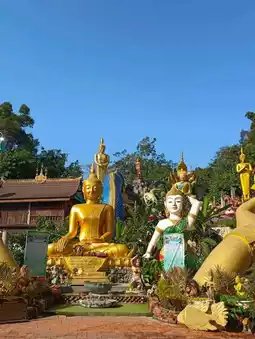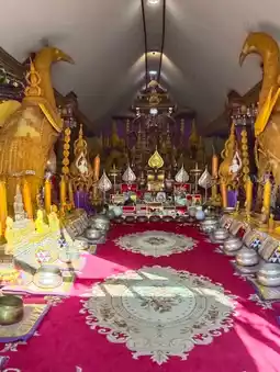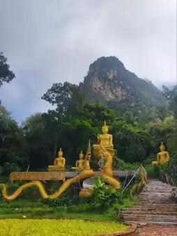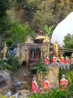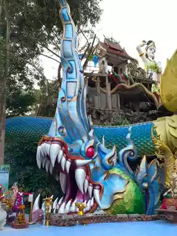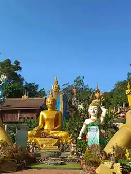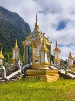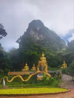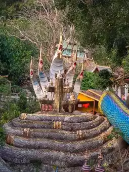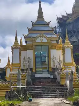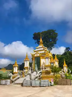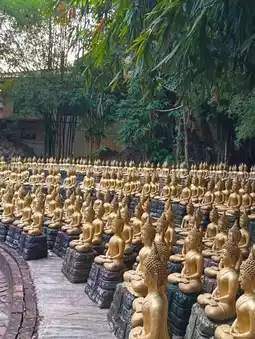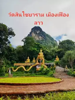"Wat Sin Chaiyaram" is a beautiful temple renowned for its Naga path connecting to Kham Chanod. The temple grounds offer a shady, cool atmosphere and a mystical atmosphere that truly deserves a visit. Surrounded by mountains, this large temple was built in conjunction with forest conservation efforts. It serves as a Buddhist park for the study of Dharma and Buddhism. The temple houses a large Naga statue, measuring 186 meters long, making it the largest Naga in Laos today. Its name, Pu Nanthopananda Naga, is revered by both Lao and Thai people, who often come to pray for good fortune and blessings. Another highlight is the Phra Buddha Chana Mara Plaza and the Royal Dharma Hall, which houses the royal chariot used in the Phra Than Ngon procession, surrounding the That Luang Stupa. There are also betel nuts made from beeswax. Laotians often come to offer alms to the monks to increase their merit and dedicate their wealth to Buddhism. This is a temple not to be missed when visiting Muang Phueng.