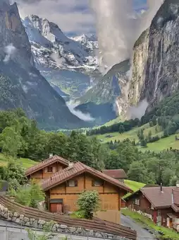 The most spectacular among them is Staubbach Falls, plunging nearly 300 meters directly into the valley, making it one of Europe's highest free-falling waterfalls. You can walk along the trail behind the falls and feel the power of the spray rushing toward you.