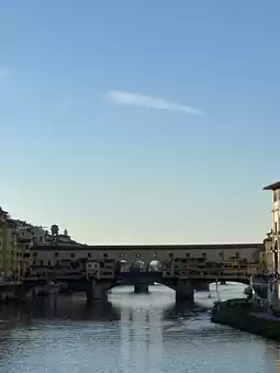 The Arno River snaking through the city, spanned by bridges including the famous Ponte Vecchio with its jewelry shops.