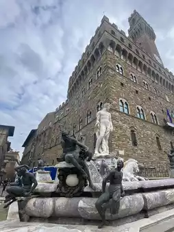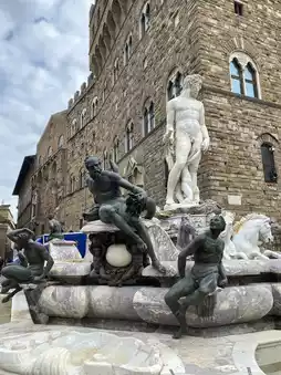 Start your journey in Piazza della Signoria, the city’s open-air gallery. Here, you’ll find Michelangelo’s David—or rather, its flawless replica standing proudly in front of Palazzo Vecchio, while the original masterpiece is kept in the Galleria dell’Accademia just a short walk away. Alongside David, the square hosts Cellini’s Perseus, holding the severed head of Medusa with chilling elegance, and Giambologna’s Rape of the Sabine Women, a twisting marble marvel capturing movement like few sculptures ever have.