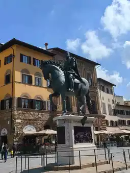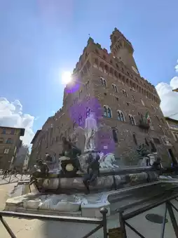 There's also a pavilion for cool air and free water. The completely open-air replicas of famous artworks are available for photo opportunities. Nearby are the Loggia della Signoria, the Palazzo Vecchio, the Fountain of Neptune, and the Uffizi Gallery. Florence's Town Hall, with its tower offering panoramic views of the city, is also worth a visit. While in the square, stop by the Fontana del Porcellino, the Wild Boar Fountain, a place where many people would drop coins in hopes of wealth.