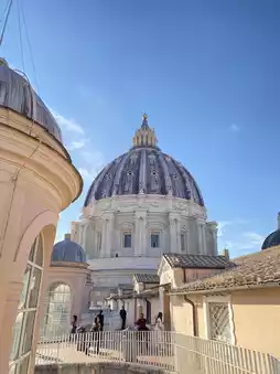 From the top, you can overlook Rome and Vatican City, including the semi-circular St. Peterโs Square and the Vatican Museums. Back on the dome's walkway, you can admire the church's opulent interior and mosaic murals. Viewing the church from the dome makes its grandeur even more apparent, with even a single letter on the wall being twice the size of a person, making you feel incredibly small.