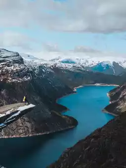 This is a true trek, taking about 10–12 hours round trip. The trail leads through rocks, streams, and snowy patches. At the top, you'll reach one of Norway's most iconic spots: the edge of a cliff over an abyss, where you feel like you're standing on the edge of the world.