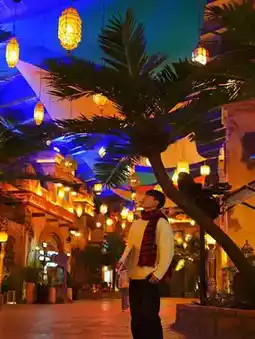 A tropical island-style street where you can sit and drink tea, chat, and relax.