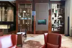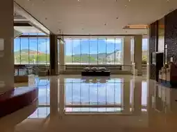 2. The hotel lobby is on the second floor, with the arrival lobby on the first. A bright red Hong Kong-style trolley laden with Shunde snacks and a coffee machine greet you upon arrival, offering a taste of local charm. The second-floor lobby features floor-to-ceiling windows that frame the beautiful mountain views, bringing the outdoors in.