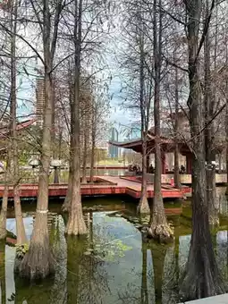 This boardwalk lined with bald cypress trees is located in the north area of the park. Navigate directly to "Reading Station" to reach the bald cypress area. There are not only Chinese pavilions and ancient-style boardwalks, but also fountains and mist. Sunlight sprinkles on the lakeside, creating shimmering waves and adding depth to the scenery!