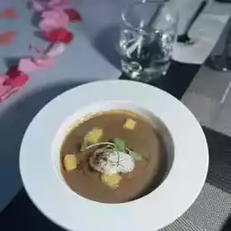 The starter is crispy tuna tartar, which is super exquisite✨, served with a day salad🥗 and mushroom soup🍄🟫. Main course: Battle ax pork chop thickly sliced, juicy to the point of leaking meat juice😋. Another angel noodles hung with green sauce and bouncy prawns go well together🦐.