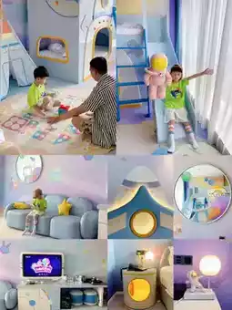 The room is full of space and cosmic elements, such as a slide, tent, and board game, as well as a space capsule-shaped bunk bed, astronaut dolls, an astronaut moon landing lamp, and a space puzzle, making children feel as if they are in space and instantly transform into little astronauts.