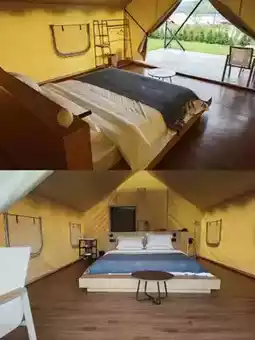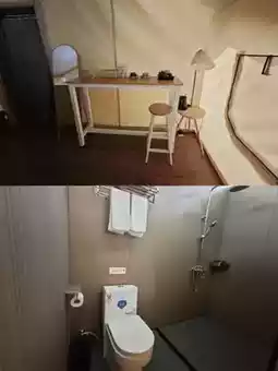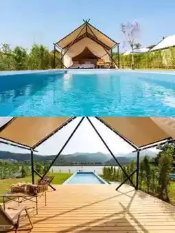 We stayed in the Pool Lake View Courtyard King Suite, the tent-style design is very unique, spacious with 50㎡, not feeling cramped at all. The 1.8m king bed is soft and comfortable, and we slept very well at night. The tent is fully equipped with a private bathroom, air conditioning, refrigerator, sofa bed, and 24-hour hot water, all star hotel quality but still retaining the wild charm of camping. The biggest surprise is the 27㎡ private pool at the door, seamlessly connected to the tent, so you can jump in and swim anytime, enjoying the lake and mountain scenery while swimming — the experience is simply unbeatable!