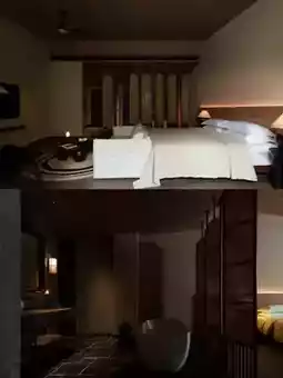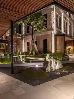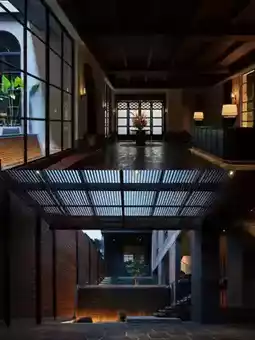 A stunning blend of old and new: retains the original factory building structure and historical marks, integrated with modern design. The courtyard water features paired with vintage brick walls and wooden structures exude strong Eastern charm; the corridor lighting creates a full atmospheric vibe, perfect for photos.