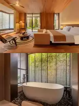 Spacious rooms with thoughtful amenities: 70㎡ large rooms are super spacious, featuring a 2.2-meter round bed, double bathtub, double washbasin, tea room, and office area—all included. Comfortable bedding, plus free tea sets and a mini fridge, making your stay extremely cozy.