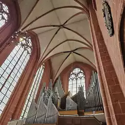 The Kaiserdom is not only remarkable for its grand exterior but also for its sacred atmosphere and historical relics inside, making it a place worth exploring at a leisurely pace. The cathedral's long corridors, high ceilings, and intricate altars showcase the essence of Gothic architecture. Particularly noteworthy are the relics of St. Bartholomew and the **Crucifixion** sculpture by Hans Backoffen, created in the 16th century. As the site where Holy Roman Emperors were elected, the cathedral offers the joy of discovering historical traces throughout its premises.