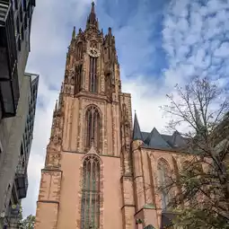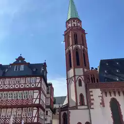 Old Nikolaikirche is a key building in framing the entire Römerberg square. It's a perfect backdrop, especially for photographers. The contrast between the red brick and white decorations creates a striking contrast, and on a clear day, the colors are even more vivid and beautiful. #TravelGuide's photo tips include: 1) framing the facade of the church alongside the statue of the Goddess of Justice in the center of the square; 2) contrasting the V-shaped roof of the Römer Town Hall next to the church with the church's spire; and 3) taking a portrait from an outdoor cafe in front of the church with the church's exterior as the background.