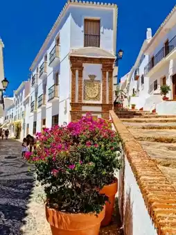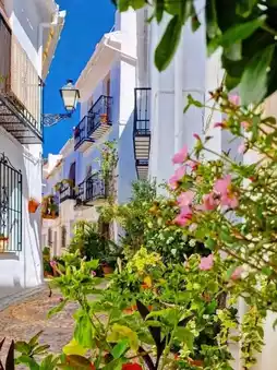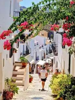 Frigiliana is a whitewashed dream rising into the Andalusian hills, where narrow, flower-lined streets wind upward through silence and sun. Its Moorish heritage lingers in every tile and curve, while bougainvillea spills from balconies and the scent of jasmine drifts on warm air.