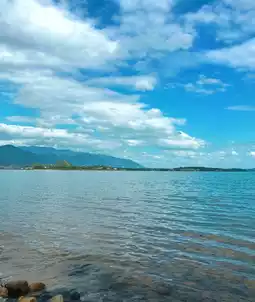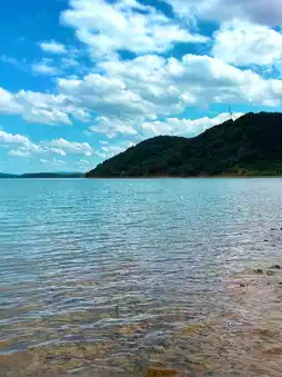 A stunning first sight! Rolling mountains embrace the clear water, giant windmills slowly turning