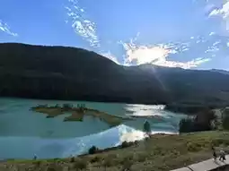 Arrive at the viewing platform before sunrise! When the morning mist swirls, it looks like a fairy spilled a palette of colors. In September and October, you can also see golden larch leaves reflected in the lake.