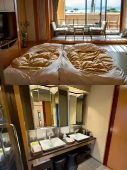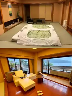 Although the hotel is relatively old and not big, the facilities are very complete. You can soak your feet in the hot spring on the balcony of the room and enjoy it while soaking. There are various soft drinks in the rest area on the first floor, and you can drink local beer, red wine and white wine for free. Dinner is omakase in the room. It is carefully prepared every day and tastes very good!