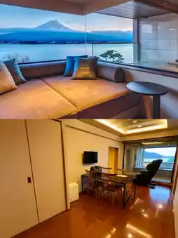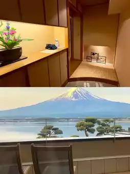 I did a lot of research on choosing a hotel before setting off, and in the end I was very happy to choose Shuhokaku Kogetsu, which faces Mount Fuji and is right on the edge of Lake Kawaguchi. The room also has the most frontal view. It happens to be a good weather day, so I can see Mount Fuji in various lights at once.