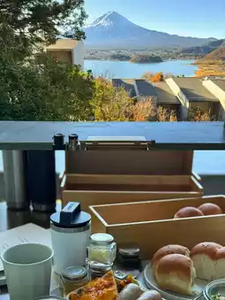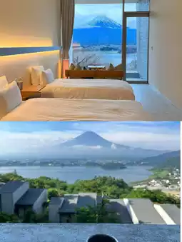 I was also very satisfied with the design and environment of the hotel. The white design of the room is very aesthetic, and the space has no extra decoration, which makes people feel comfortable. Most importantly, the large windows in the room offer views of Mount Fuji and Lake Kawaguchi, and you can see the magnificent mountain view when you look up.