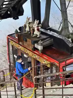On the mountain, you can overlook Mount Fuji, pay to swing facing Mount Fuji 🗻, buy meatballs shaped like Mount Fuji at the Tanuki Tea House 🍡, and take photos at the Rabbit Shrine and the clock in the sky. Due to the large number of tourists, there is a queue for every project on the mountain, so the expected tour time is about 2.5 hours starting from taking the cable car from the foot of the mountain.