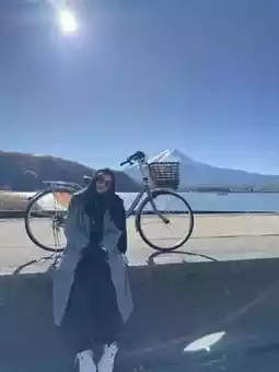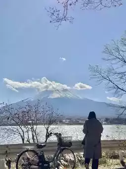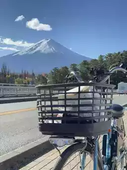When we arrived at Kawaguchiko station, we rented bicycles to ride around the lake. It was very convenient. We didn't get tired riding because the view was very beautiful. We enjoyed ourselves for a short while and had already completed the round. We stopped to take pictures along the way. We were very impressed. 💖🍁