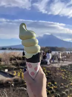 âĒ Photogenic moment: That pale-green soft serve against the snowy landscape and blue sky makes for a unique shotâice cream in winter, Fuji in the background!