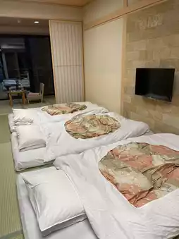 🛏️ The room is very clean and spacious. It's the first time I've slept on a beautiful futon like this. Importantly, this room has a "private onsen" where you can soak in hot water while enjoying the view of Mt. Fuji from the balcony — it's so beautiful.