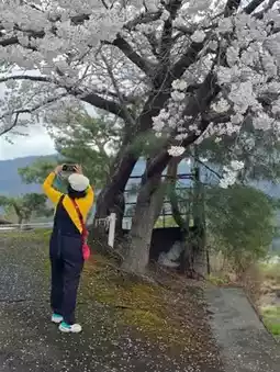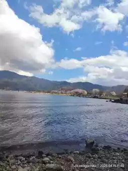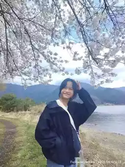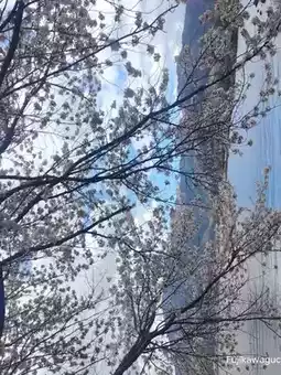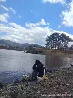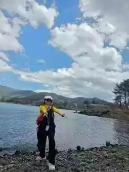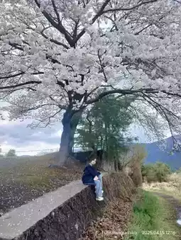 The aunts took the green bus to this point because when they were driving past yesterday and this morning, they saw a large cherry tree and a beautiful long lake. They stopped to have a picnic and lunch here. The atmosphere is great, right on the lake. You can feel the clear, cool water, alternating large and small round rocks, the bright blue sky, white clouds contrasting with the sky, being filled with nature, taking deep breaths of fresh air, and the gentle breeze. When you see a large cherry tree, it's great to take pictures. Stop by. The atmosphere is really great.