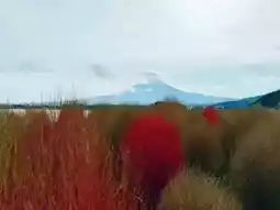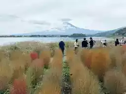 We visited Oishi Park by the lakeside, a place renowned for its stunning views of Mount Fuji and seasonal flowers. It was autumn, and the park's kochia plants (コキア, also known as broom grass) were in their prime viewing season. These fluffy, round shrubs had partially turned a charming orange-red, blending beautifully with the surrounding greenery and the golden hues of dried grass to create a picturesque autumn scene. Strolling through the kochia fields, feeling the gentle breeze, and watching visitors wander and take photos made for a truly relaxing atmosphere.