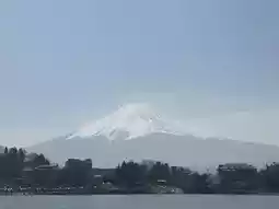 As the boat cruised across the lake, I admired Mount Fuji from various angles. At times, it blended harmoniously with the distant mountains and lakeside buildings, forming a picturesque landscape; at other times, it became the sole focus of the view, compelling me to gaze intently at its beauty. On the lake, a speedboat raced by, leaving a long trail of white spray that disrupted the calm surface, yet added a dynamic touch to the serene scene.