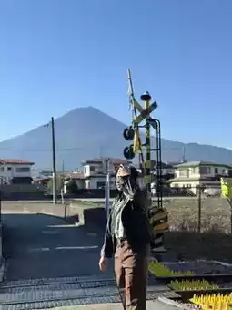 📍Starting from the station, there's a parking area and a cute sign with a train and Mount Fuji in the background. It's absolutely stunning!