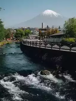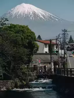 A thousand-year-old shrine by the stream with the image of Uncle Fuji in the background.