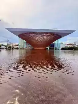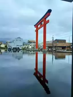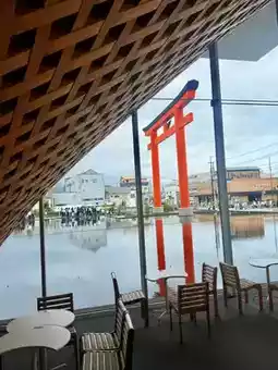 The vermilion torii gate, symbolizing entry into the realm of the gods, stands beside the World Heritage Center of Mount Fuji. The center cleverly adopts the shape of an inverted Mount Fuji, positioned symmetrically with the torii gate. Its water pool reflects Mount Fuji and the torii gate, creating an entrance to a sacred and surreal world.