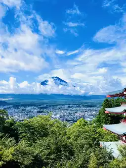The view of Mount Fuji from Arakurayama Sengen Park is one of the most iconic and breathtaking sights in Japan. The park, located in Fujiyoshida City, offers a stunning panoramic view of Mount Fuji, especially when framed by the famous Chureito Pagoda—a five-story red pagoda that stands against the backdrop of the majestic mountain.