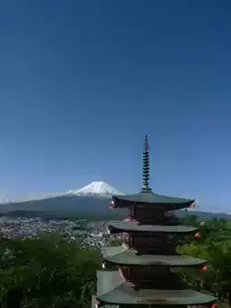 Start your morning by climbing the 398 stone steps, passing through the torii gate, and walking along the shaded path. As the five-story pagoda comes into view and the majestic Mount Fuji unfolds like a painting before your eyes, the moment is truly breathtaking. On a clear day with low clouds, it feels as if the entire city has come to a standstill, leaving only the mountain and pagoda in conversation.