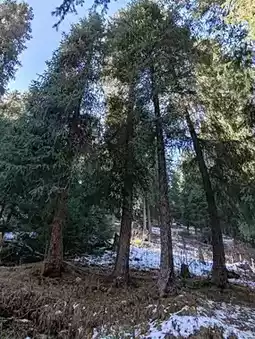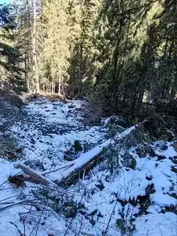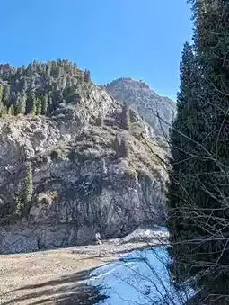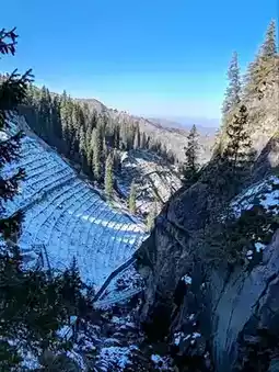 Feilong Pond, originally formed by the overflow of Tianshan Heavenly Lake, was once renowned for its emerald waters and cascading waterfalls. However, under the influence of winter's low temperatures and the dry season, the sight that now meets the eye is strikingly different. The pond has completely dried up, exposing vast stretches of gravel and earth, blanketed by snow, evoking a profound sense of solitude. Just a short distance away, where the "Flying Dragon's Cascade" still roar, but at the pond here,only steep cliffs and surrounding pines remain, silently bearing witness to the shift of seasons and the unpredictability of nature. Beneath the vast blue sky, this valley reveals a different kind of beauty—quiet, solemn, and majestic.