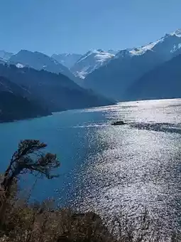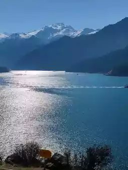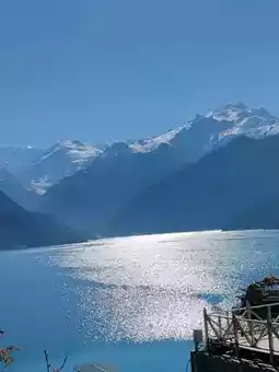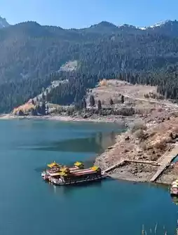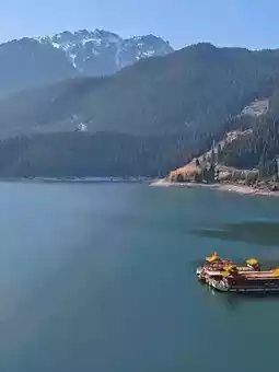 Under the clear blue sky, the waters of Tianshan Heavenly Lake shimmer with crystalline clarity. Sunlight dances upon the surface, scattering flecks of gold across the ripples. In the distance, the snow-crowned Bogda Peak rises majestically, complementing the lush spruce forests and autumn-tinted slopes that embrace the lakeshore. Antique-style tour boats moored along the bank add a touch of human charm to this magnificent alpine scene, weaving together into a serene and breathtaking landscape painting.