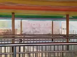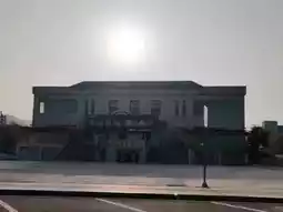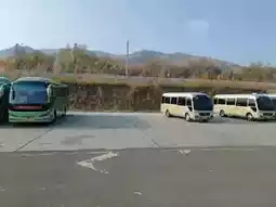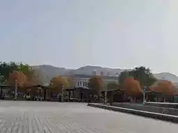 The entrance to the Tianshan Heavenly Lake is grand and dignified, flanked by two tower-like structures and adorned with bold red characters at its center that read "Heavenly Lake Tianshan." The spacious entrance plaza bustles with visitors, creating a vibrant atmosphere. Surrounding the area are well-organized parking lots and amenities, including restaurants and rest zones. The autumn scenery is particularly charming, with golden leaves dotting the surrounding slopes. Cultural decorations such as traditional patterns and mascots at the entrance set the tone for the unforgettable journey into nature and culture that lies ahead.