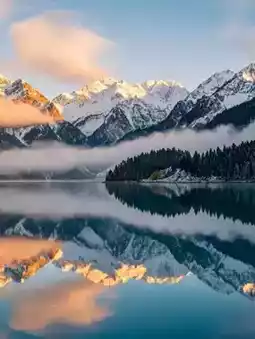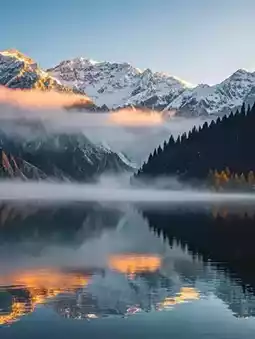 Scenic Beauty: The lake's surface is serene and blue, surrounded by snow-capped mountains, pristine forests, and alpine meadows, showcasing a classic alpine glacial lake landscape.